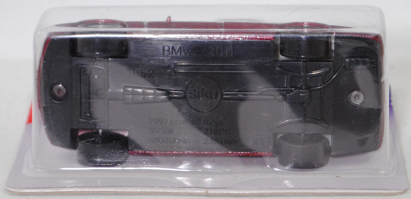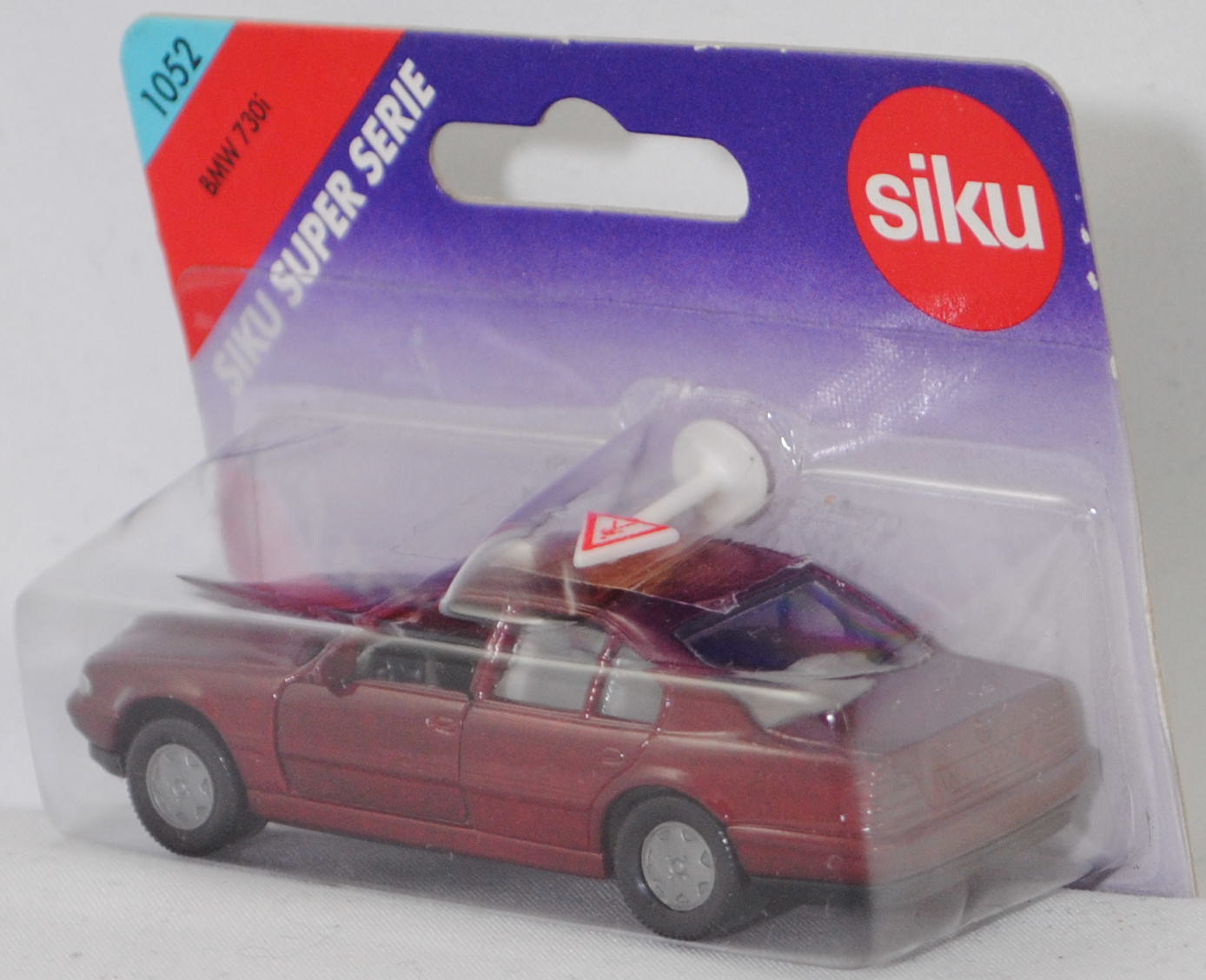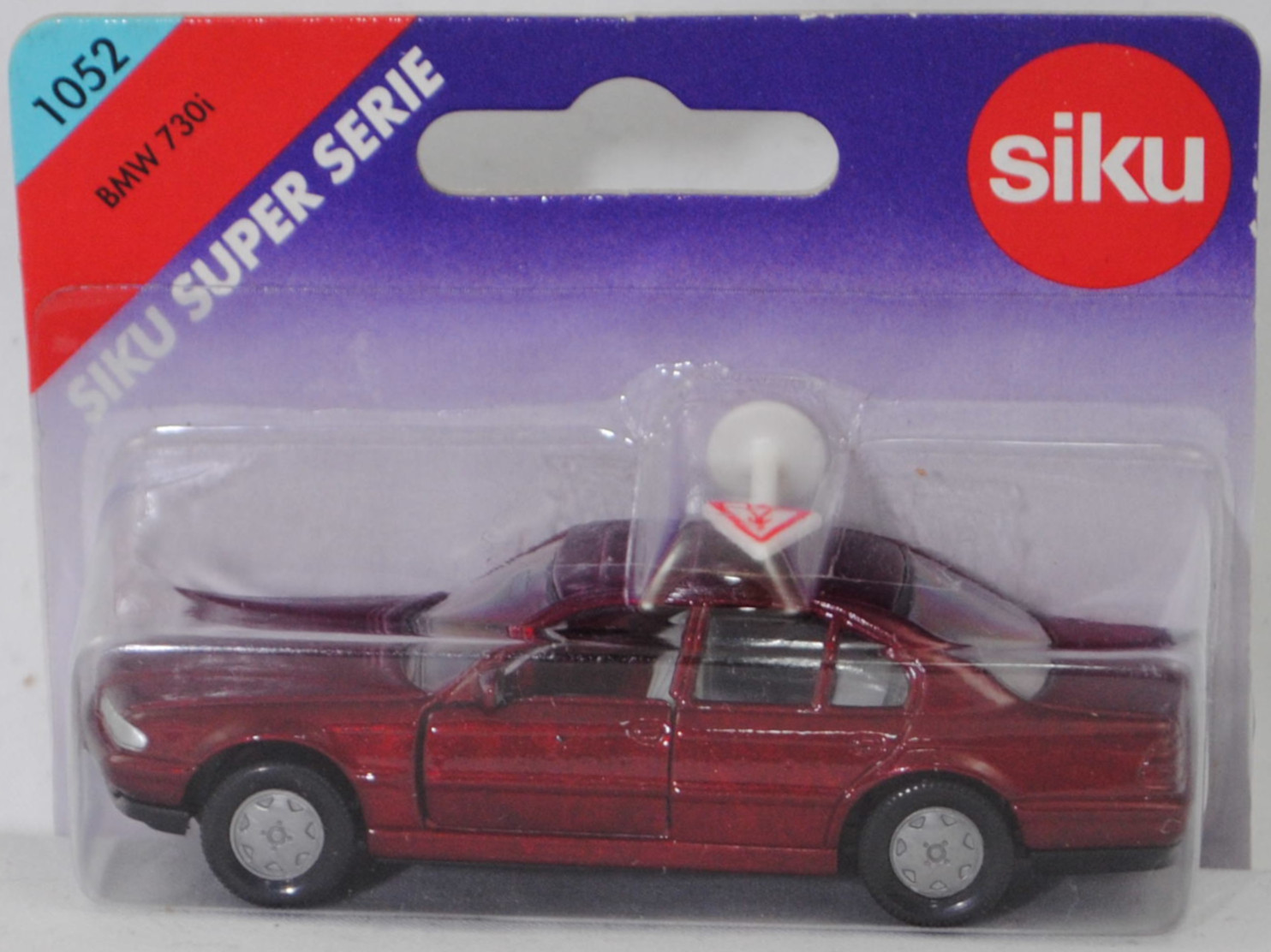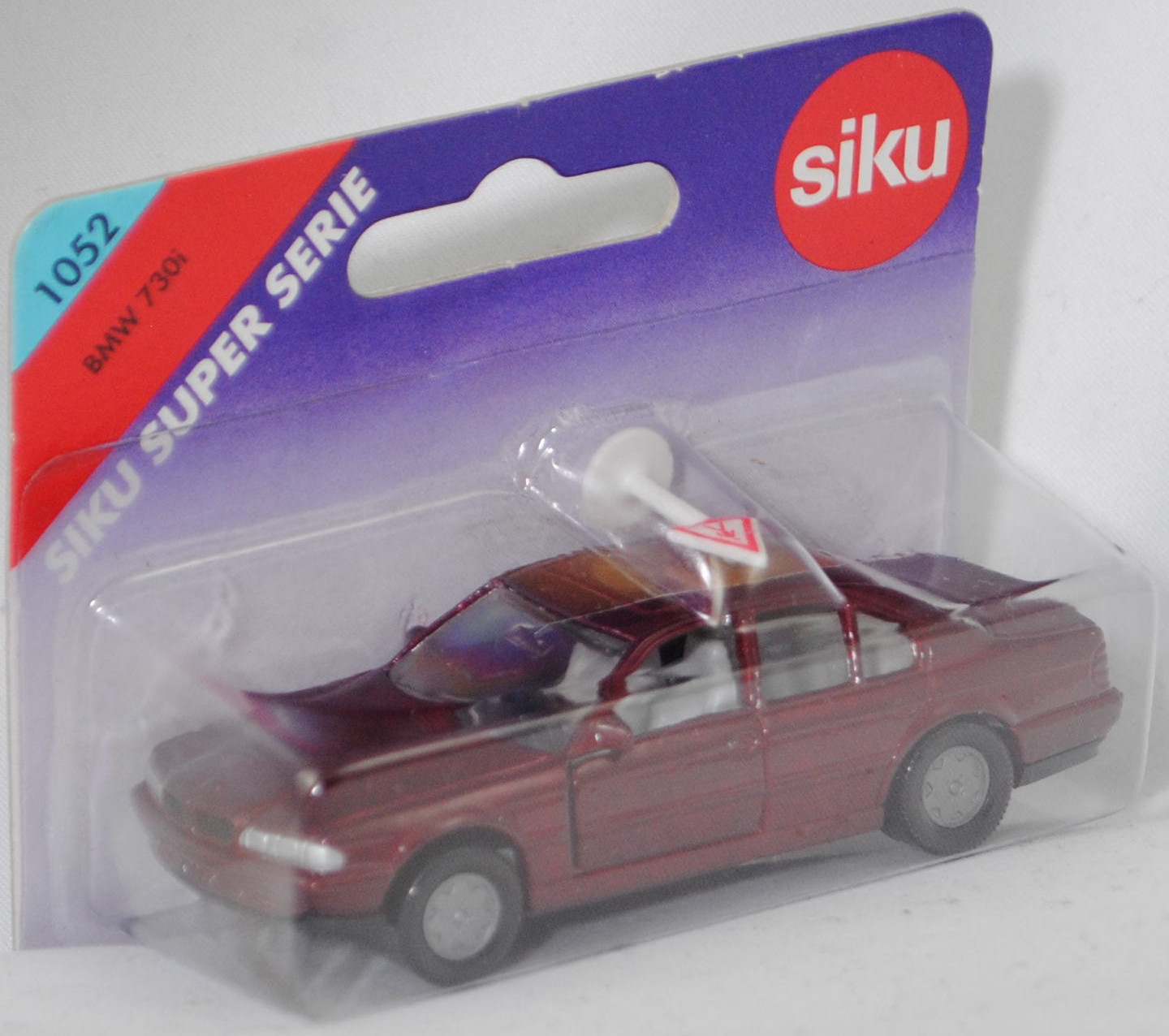 00001 BMW 730i (3. Generation, Baureihe 7er-Reihe, interne Baureihenbezeichnung E38, viertürige Stufenhecklimousine mit 5 Sitzplätzen, Vorfacelift (bei BMW Vor-LCI = vor Lifecycle Impulse genannt), Frontscheinwerfer an der Unterseite mit geradem Abschluss, senkrechte Streben in der BMW-Niere an den Enden abgerundet, ohne Chromzierleiste auf dem Kofferraumdeckel über dem Nummernschild, Blinker hinten mit gelber Verglasung, Rückfahrscheinwerfer mit weißer Verglasung, Ausstattungslinie 730i: kurze hintere Tür + Scheibe der hinteren Tür vor dem Dreieck oben kürzer als die Scheibe der Vordertür oben bis zum Beginn der Abschrägung + 8-Zylinder-Motor mit 2997 cm³ und 218 PS + Nebelscheinwerfer + Außenspiegel beheizt und elektrisch von innen einstellbar + Außenspiegelgehäuse in Wagenfarbe lackiert + Fensterheber elektrisch mit Komfortschaltung vorne und hinten + Kartenleseleuchten vorne + Leseleuchten im Fond + Make-up-Spiegel beleuchtet für Fahrer und Beifahrer + Radio BMW Business RDS + Heckscheibenantenne inklusive Antennen-Diversity + 5-Gang-Schaltgetriebe + Servolenkung drehzahlabhängig + Multifunktionslenkrad zur Bedienung von Radio, Geschwindigkeitsregelung und Umluftschaltung + Airbag-Lenkrad + Airbag für Beifahrer mit Sitzbelegungserkennung + Armauflage vorne inklusive Ablagefach + Fahrer- und Beifahrersitz höhen- und längsverstellbar, Fahrersitz zusätzlich neigungsverstellbar + Kopfstützen vorne und hinten + Mittelarmlehne im Fond mit Ablagefach + Wärmeschutzglas grün rundum + Leichtmetallräder Größe 7,5 J x 16 mit Reifen 215/65 W 16, Sonderausstattung gegen Mehrpreis: Schiebe-hebedach elektrsch (Bestell-Code 401), 5-Gang-Schaltgetriebe, Hinterradantrieb, Motor: BMW Typ M60B30 wassergekühlter Achtzylinder-V-Viertakt-Otto mit Mehrpunkteinspritzung und zwei obenliegende Nockenwellen (DOHC = Double Overhead Camshaft) je Zylinderbank sowie 4 Ventile pro Zylinder und 2997 cm³ sowie 218 PS, Radstand 2930 mm, Länge 4984 mm, Modell 1994-1996), dunkel-weinrotmetallic, innen lichtgrau, Sitze lichtgrau, Lenkrad schwarz, Bpr. BMW 730iL, Verglasung rauch, B6 (BMW Leichtmetallräder im 15-Speichen-Design Typ Styling 6 Größe 7,5 J x 16 ET 20 mit Lochkreis 5 x 120 (Teilenummer 36111181840, Farbcode silber) und Nabendeckel / Radzierdeckel (Teilenummer 36131181897, Farbcode silber) und BMW Emblem (Teilenummer 36131181080, Farbcode schwarz/blau/weiß) sowie Reifen 215/65 ZR 16 100W), SIKU SUPER, ca. 1:58, P27 (Vitrinenmodell, Schachtel mit Lagerspuren) (EAN 4006874010523)