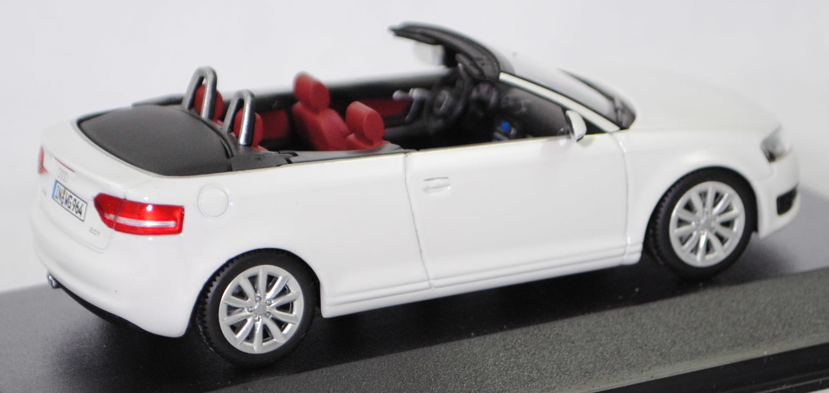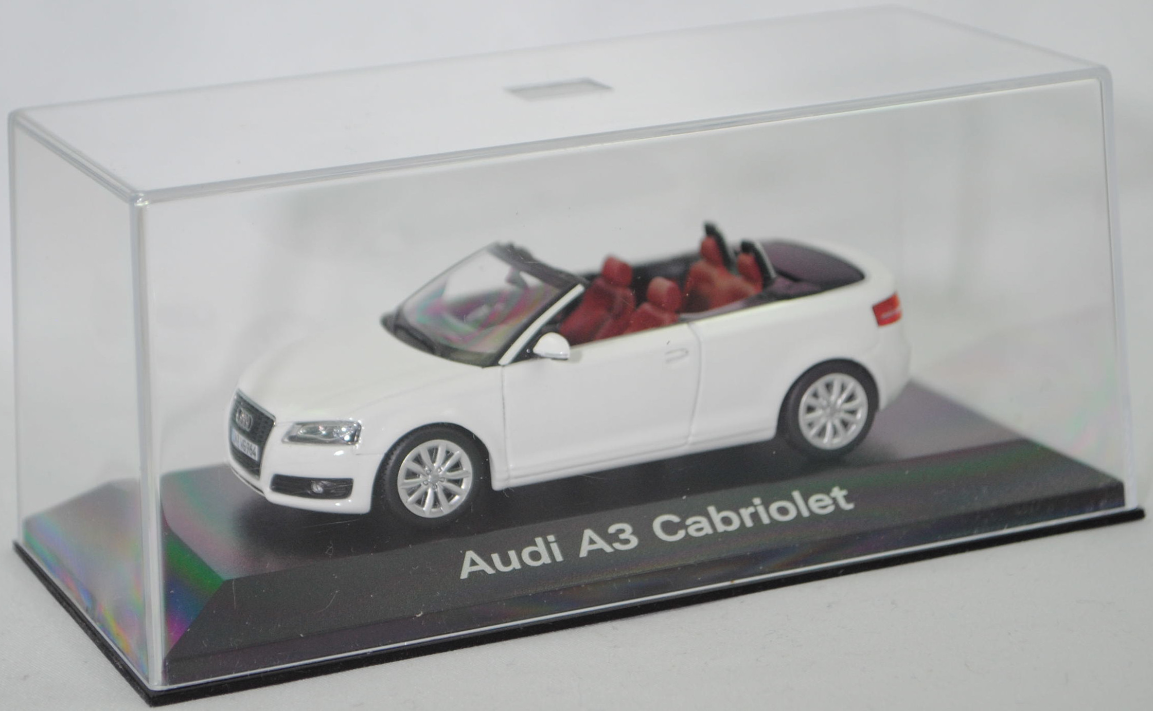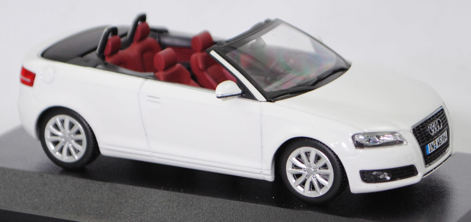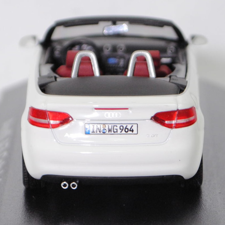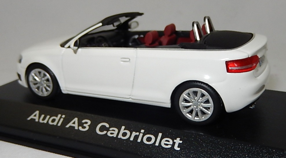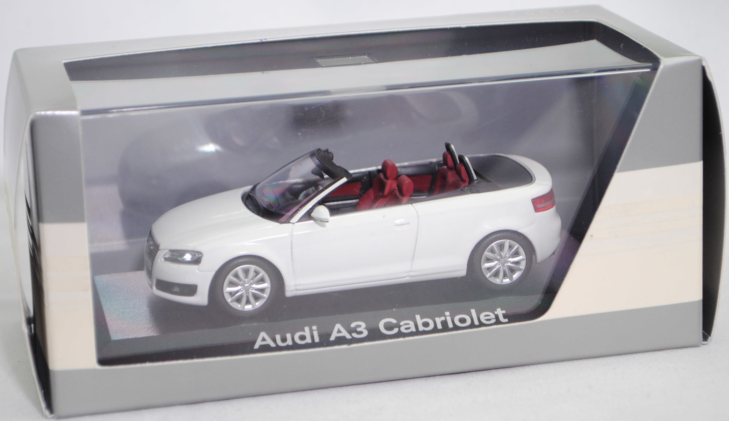 Audi A3 Cabriolet 2.0 TFSI Ambition (1. Generation Audi A3 Cabriolet bzw. 2. Generation Audi A3, Baureihe A3 Cabriolet, interne Baureihenbezeichnung 8P, zweitüriges Cabriolet mit 4 Sitzplätzen, Facelift 2008 zum Modelljahr 2009, Nebelscheinwerfer im Stoßfänger etwas nach innen versetzt, Stoßfänger vorne mittig unter dem Kühlergrill mit drei Lüftungsschlitzen, seitliche Blinker in den Außenspiegeln integriert, Ausstattungslinie Ambition: Halogen Nebelscheinwerfern in die Frontschürze integriert + Fahrerinformationssystem inklusive Funkuhr und Datumsanzeige sowie digitaler Geschwindigkeitsanzeige + Dekoreinlagen Micrometallic platin in Türverkleidung und Mittelkonsole + Sportsitze vorne mit Sitzbezüge in Stoff Dynamik + Beifahrersitz höheneinstellbar + Sportlederlenkrad im 3-Speichen-Design inklusive Schalthebelknauf und Handbremsgriff in Leder + Einstiegsleisten mit Aluminiumeinlage und Audi Schriftzug + Windschott mit neuartigem Bedienkonzept zur leichten Anbringung, reduziert die Windströmungen im Innenraum + Sportfahrwerk, Sonderausstattung gegen Mehrpreis: Audi Aluminium-Gussräder im 10-Speichen-Design in royalsilber Größe 7,5 J x 17 mit Reifen 225/45 R 17, 6-Gang-Schaltgetriebe, Frontantrieb, Motor: VW Typ EA888 wassergekühlter Vierzylinder-Reihen-Viertakt-Turbo-Otto mit Direkteinspritzung und zwei obenliegende Nockenwellen (DOHC = Double Overhead Camshaft) sowie 4 Ventile pro Zylinder und Ladeluftkühler sowie 1984 cm³ und 200 PS, Motorkennbuchstabe CCZA, Radstand 2578 mm, Länge 4238 mm, Modell 2008-2013), ibisweiß (Verkaufskennzeichen T9, Lacknummer LY9C), innen hell-purpurrot/schwarz, Sitze hell-purpurrot, Lenkrad schwarz, Audi Aluminium-Gussräder im 10-Speichen-Design in royalsilber Größe 7,5 J x 17 H2 ET 56 mit Lochkreis 5 x 112 (Teilenummer 8P0 601 025 CD, Farbcode 1H7 royalsilber) und Nabendeckel / Radzierkappe (Teilenummer 8R0 601 165, Farbcode 7ZJ grau-metallic) sowie Reifen 225/45 ZR 17 91Y, Minichamps, 1:43, PC-Box Werbeschachtel (Limited Edition quattro GmbH, Audi collection, Vitrinenmodell, Schachtel vergilbt und mit Lagerspuren) (EAN 2050000392719)