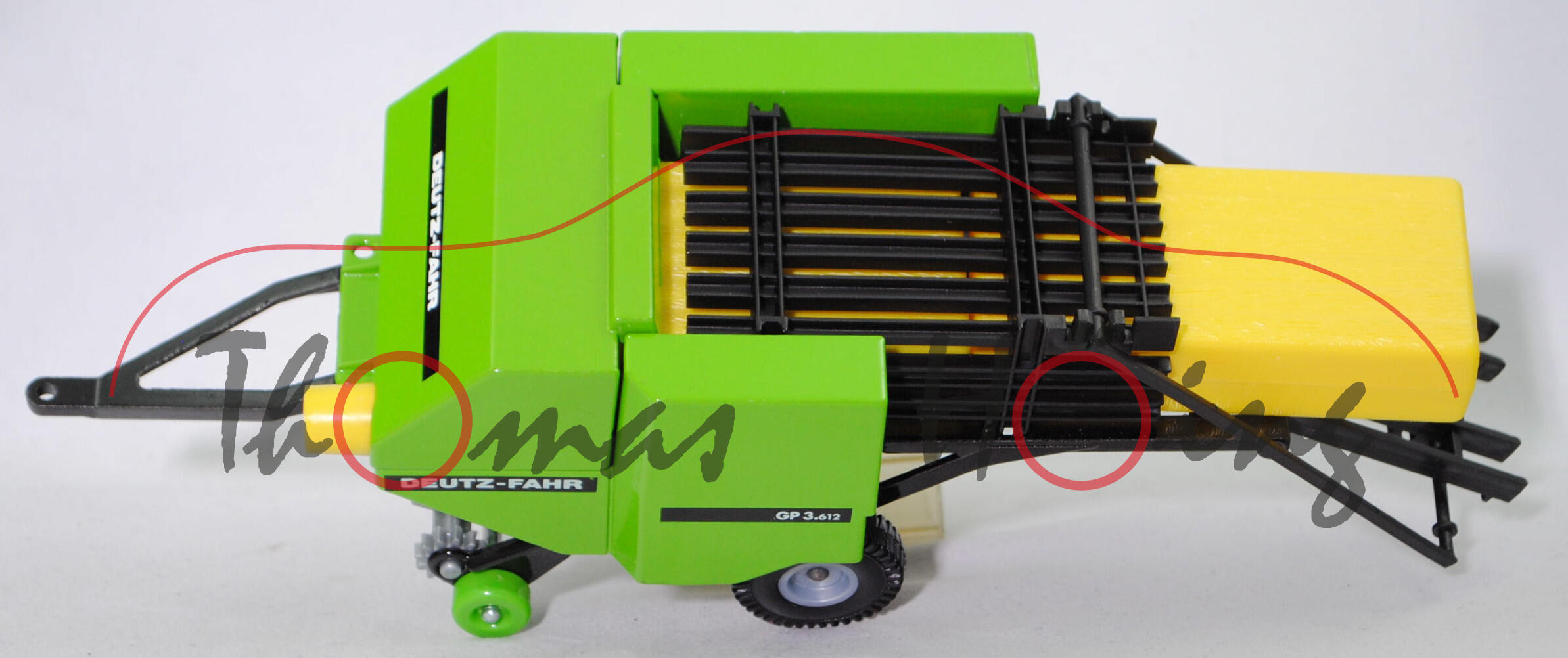 00000 DEUTZ-FAHR-Großpackenpresse GP 3.612 (Baureihe GP, Typ einachsige Rechteck-Großpackenpresse, Aufnahmebreite der Pick-up 2100 mm, wartungsarme 5 Knoter Bindung, Garn: 130 - 160 m/kg, Garnvorrat: 20 Rollen, Ballenmaße h/b/l = 0,60 / 1,20 / 1,20 bis 2,80 m, Ballengewichte: 260 kg (Stroh) bzw. 380 kg (Heu), Preßdichte: 150 kg/m³ (Stroh) bzw. 250 kg/m³ (Heu), erforderliche Traktorleistung: 100 PS, zulässiges Gesamtgewicht 2850 kg, produzierte Maschinen: 20 Stück, Hersteller: GREENLAND G.m.b.H. CO KG Erwin-Dietrich-Platz 1 7702 Gottmadingen, Vertrieb: DEUTZ-FAHR Landmaschinen-Vertriebs GmbH, Breite 2360 mm, Höhe 2100 mm (in Arbeitsstellung) bzw. 2520 mm (in Transportstellung), Länge 7350 mm (in Arbeitsstellung) bzw. 5850 mm (in Transportstellung), Modell 1989-1990), Schutzhülle incl. Türen und Schutzhaube gelbgrün, Druck Streifen in schwarz mit zusätzlichem Druck DEUTZ-FAHR und GP 3.612 in reinweiß auf den Seiten der Schutzhülle, Druck Streifen in schwarz mit zusätzlichem Druck DEUTZ-FAHR in reinweiß vorne auf der Schutzhaube, Gelenkwellenschutz zinkgelb, Förderrollen zinkgelb, Pressschienen schwarz, Ballenablage und Zugbügel mit Zugstrebe schwarz, Halterung für Pick-up und Tasträder schwarz, Pick-up silbergrau, Tasträder gelbgrün, Chassis mit Universaldeichsel schwarz, Radausschnitt auf der beiden Seiten 6 mm hoch und auf der rechten Seite ohne Auskerbung, unterseitige Verstärkung der Schützhülle auf der kurzen Seite 5 mm breit und auf der langen Seite vorne 4 mm und hinten 5 mm breit, Bpr. siku-Logo und CE-Zeichen sowie Germ mittig auf dem Chassis unter der Achse, schmale Felgen in silbergrau mit seitlich im unteren Bereich geriffelten Reifen (DEUTZ-FAHR Stahlfelgen Größe 9.00 x 15 ET 5 mit Reifen 11.5/80-15.3 8 PR), Zubehör: 2 Rechteck-Großballen in zinkgelb, SIKU FARMER 1:32, ca. 1:32, L14a (Vitrinenmodell, Schachtel mit Lagerspuren) (EAN 4006874029549)