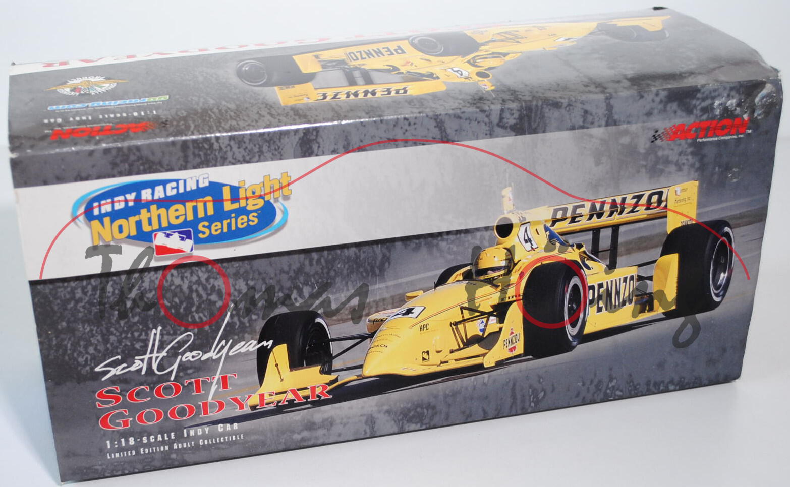 Dallara, zinkgelb, INDY RACING Northern Light Series 2000 (2. Platz), Fahrer: Scott Goodyear, Team Panther Racing, Motor: Oldsmobile, Nr. 4, Sponsor: PENNZOIL, Motorhaube + Abdickung vorne zu öffnen, mit Lenkung, ACTION RACING COLLECTABLES, 1:18, mb