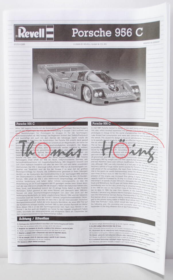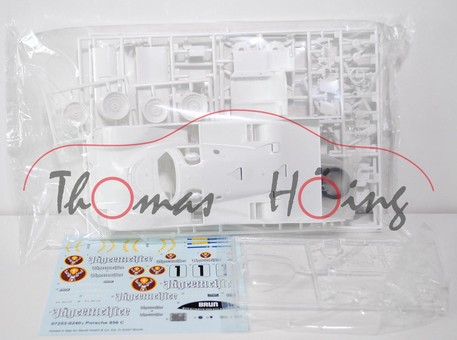 Porsche 956B Gruppe C (Typ 935/76 F6 4v DOHC 2649cc 2x KKK K26), Modell 82-84, orange, DRM (Deutsche Rennsport-Meisterschaft) 1985, Fahrer: Stefan Bellof, Team: Brun Motorsport, Nr. 1 (1. Platz Norisring 30.6.85), Sponsor: Jägermeister, Kit, Revell, 1:24