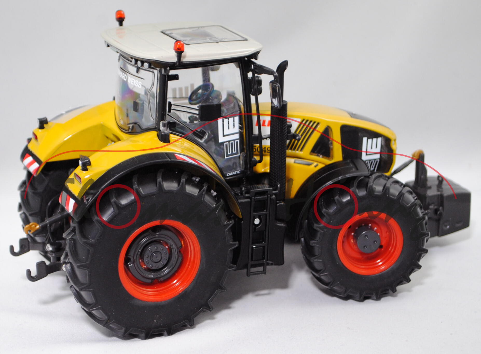 CLAAS AXION 930 Traktor (1. Generation, Baureihe AXION 900, Allradantrieb, Motor: FPT (Fiat Power Train) Cursor-9 wassergekühlter Sechszylinder-Reihen-Turbo-Viertakt-Diesel mit Common-Rail-Einspritzung und 4 Ventile pro Zylinder sowie Ladeluftkühlung und 8710 cm³ sowie 345 PS (Nennleistung) bzw. 350 PS (Maximalleistung), Radstand 3150 mm, Länge 5590 mm, Modell 2011-2017), Dach der Kabine hell-kieselgrau, Fensterrahmen schwarz, Motorhaube honiggelb, innen hellgrau, Sitz hellgrau, Lenkrad graphitgrau, Druck CLAAS in verkehrsrot und 630 in platingrau sowie ARION in schwarz auf reinweiß auf den Seiten der Motorhaube, zusätzlicher Druck 504956 in schwarz und LEONHARD WEISS BAUUNTERNEHMUNG in reinweiß auf den Seiten der Motorhaube, Druck CLAAS in silber im Grill, Druck ARION in silber auf der Dachvorderkante, Druck CLAAS in silber auf der Dachhinterkante, 2 Rundumleuchten in orange an der Kabine, Druck LEONHARD WEISS in reinweiß auf den Türen, D-Nummernschild SHA LW 646, Druck LEONHARD WEISS in reinweiß oben und Schild 40 in schwarz/reinweiß links unten auf der Heckscheibe, Kotflügel vorne mattschwarz sowie hinten honiggelb und außen mattschwarz, Frontkraftheber und Heckkupplung umbragrau, Felgen rot mit Radnaben in umbragrau (Standardbereifung vorne 620/75 R 30 und hinten 710/85 R 38), Zubehör: Frontgewicht umbragrau, Wiking, 1:32, mb (Limited Edition 1000 pcs., Schachtel mit Lagerspuren) (EAN 4006190778602)