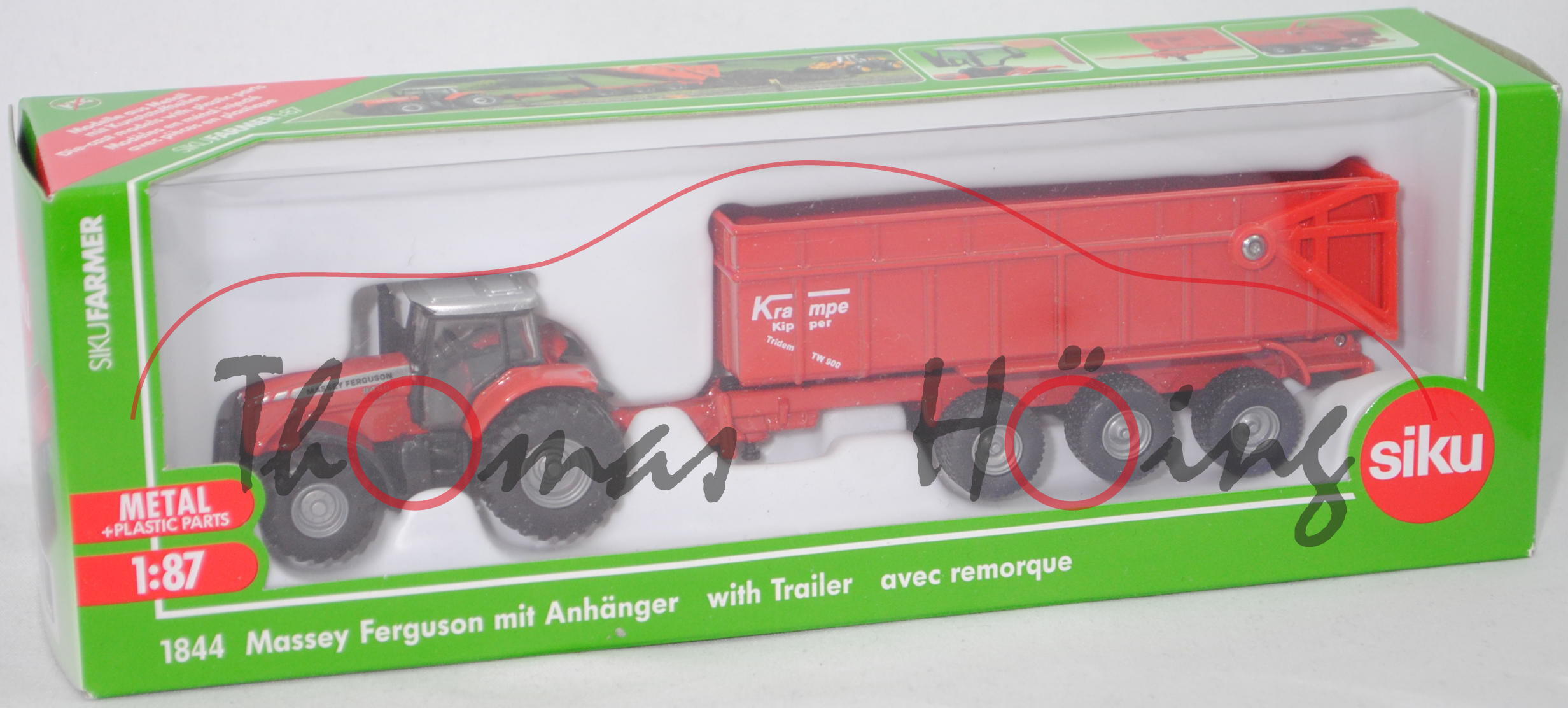 00003 Massey Ferguson MF 8480 Dyna-VT Traktor (Motor: SISU Typ 84.329 ETA, Nennleistung 290 PS bei 2200 U/min, Allrad, Radstand 3075 mm, Modell 2004-2005) mit Krampe Tridem-Wannenkipper TW 800, Traktor: silbergraumetallic/verkehrsrot/schwarz, innen verkehrsrot, Sitz schwarz, Lenkrad schwarz, MF-Logo in rubinrot/schwarz auf silber vorne auf der Motorhaube, Druck MASSEY FERGUSON in schwarz auf silbernem Streifen und 8480 / Dyna-VT in silber/schwarz auf den Seiten der Motorhaube, Dach Kabine silbergraumetallic, 87M12 silbergrau / 87M12 silbergrau; Wannenkipper: Wanne verkehrsrot, Druck Krampe / Kipper / Tridem TW 800 in reinweiß auf den Seiten, Druck Krampe und Schild 40 in reinweiß auf der Heckklappe, Fahrgestell verkehrsrot, Heckklappe hell-signalrot, C47 silbergrau, SIKU FARMER 1:87, ca. 1:87, L17mpK (EAN 4006874018444)