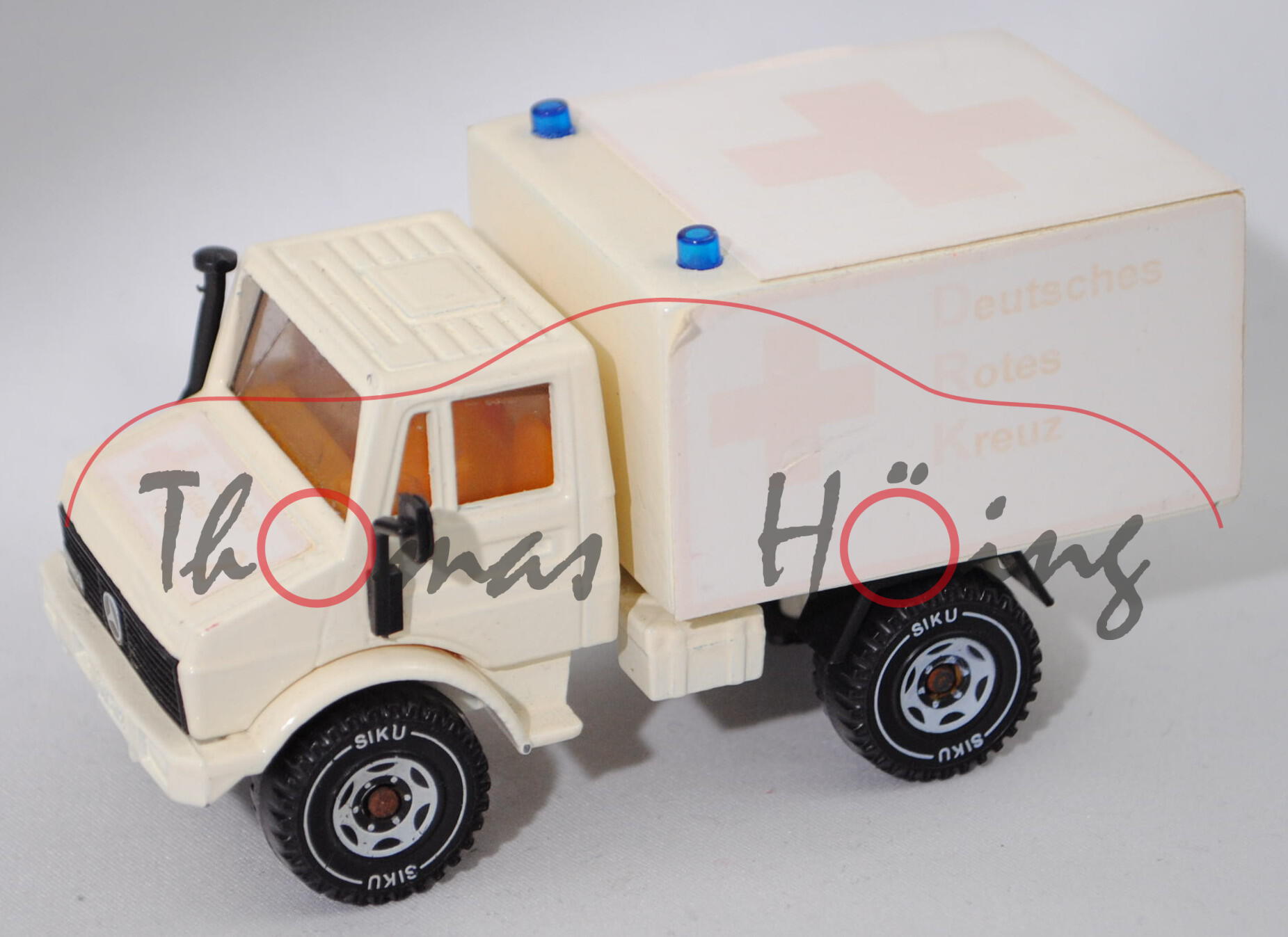 Mercedes-Benz Unimog U 1500 (schwere Baureihe Unimog (SBU), Universal-Motor-Gerät, Baureihe 425, Baumuster 425.141, Fahrerhaus geschlossen, Kühlergrill mit 6 waagerechten Streben, vordere Blinker auf den Kotflügeln im oberen Bereich des Kühlergrills, Türen im Bereich der Türgriffe mit Vertiefung über die Türbreite, zulässiges Gesamtgewicht 10600 kg, Hinterradantrieb mit zuschaltbarer Allradantrieb, Motor: Mercedes-Benz OM 352 A wassergekühlter Sechszylinder-Reihen-Viertakt-Turbo-Diesel mit Direkteinspritzung und OHV-Ventilsteuerung (Overhead valve engine) ohne Ladeluftkühler sowie 5675 cm³ und 150 PS, Baumuster Motor 353.958, Radstand 2810 mm, Länge 4750 mm, Modell 1977-1988) mit Kofferausbau, cremeweiß, innen chromgelb, Lenkrad integriert, Aufkleber rotes Kreuz und Deutsches / Rotes / Kreuz / 2 in rot auf der Motorhaube, Stoßstange und Radkasten vorne cremeweiß, Kofferaufbau neu gebaut cremeweiß, 2 Blaulichter auf dem Kofferaufbau, Aufkleber rotes Kreuz und Deutsches / Rotes / Kreuz in rot auf den Seiten des Koffers, Aufkleber rotes Kreuz und Deutsches / Rotes / Kreuz / 2 in rot hinten rechts und links auf dem Koffer, Aufkleber rotes Kreuz oben auf dem Koffer, Verglasung rauch, Sprung in Windschutzscheibe, LKW10 (Bereifung 14,5-20 18 PR), SIKU SUPER, ca. 1:55 (Umbau, Vitrinenmodell, Modell neu lackiert, Aufkleber vergilbt, minimale Farbabplatzer) (EAN 4006874016204)