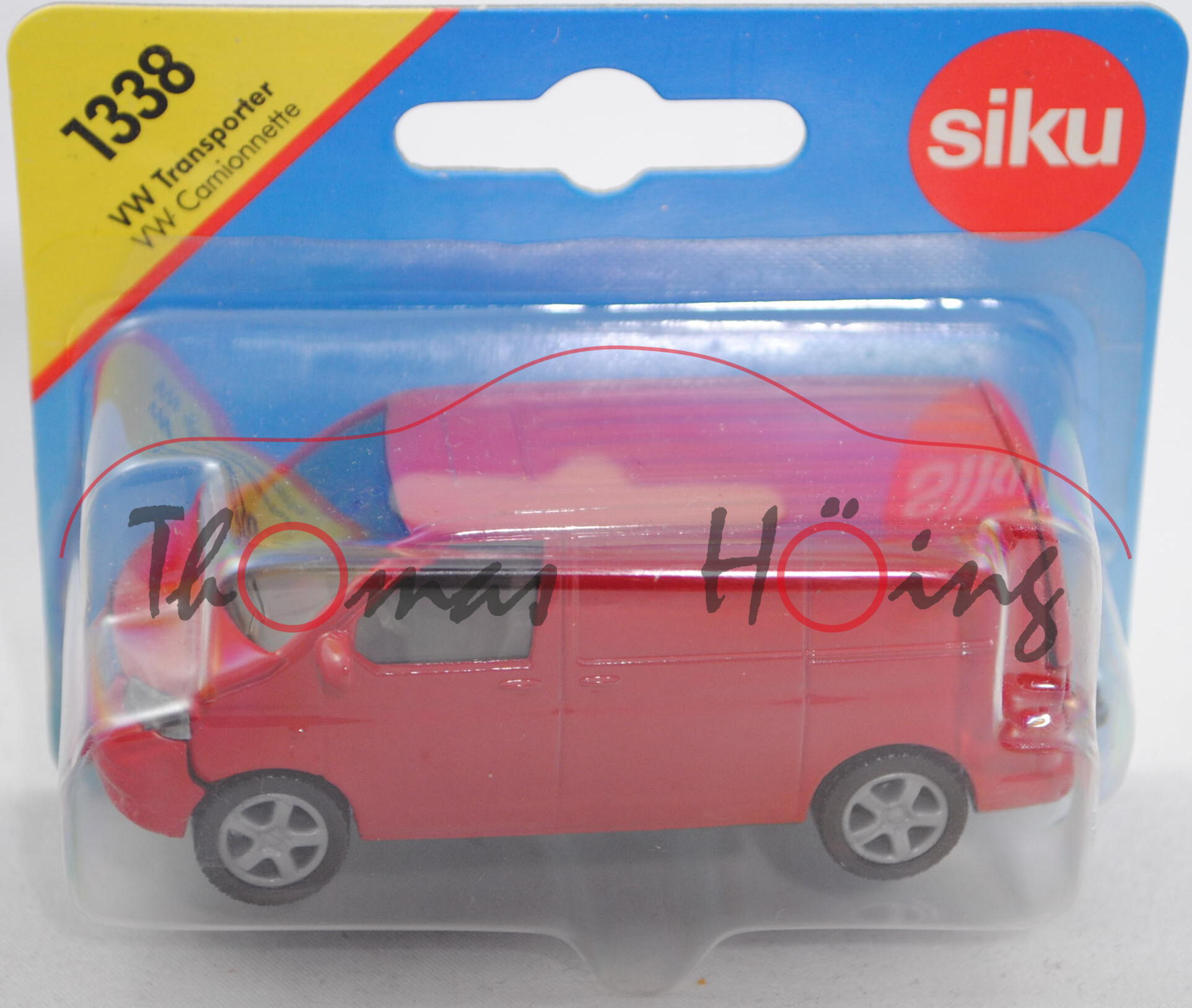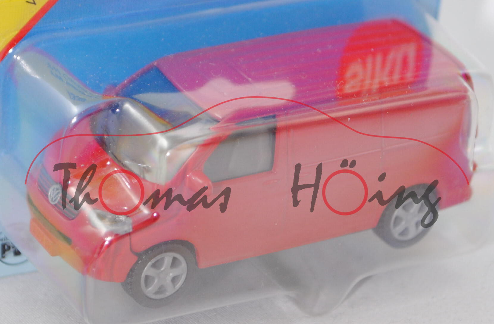00420 VW T5 Transporter (Typ 7H, Modell 2003-2009), karminrot, innen verkehrsgrau, Lenkrad verkehrsgrau, o.K., Druck VW-Logo und TRANSPORTER in silber auf der Heckklappe, Druck 4 karminrote Streifen und VW-Logo in silber im Grill, Stoßstange Bestandteil des Chassis, schwarz bedruckte Lüftungsgitter über dem Nummernschild in der Stoßstange, mit Prägung von Lüftungsgitter neben dem Nummernschild, Nummernschild SI-KU 152, Chassis basaltgrau, B21 silbergrau, SIKU SUPER, ca. 1:58, P29a (Verklebung des Blister hat sich gelöst, Limited Edition) (EAN 4006874013388)