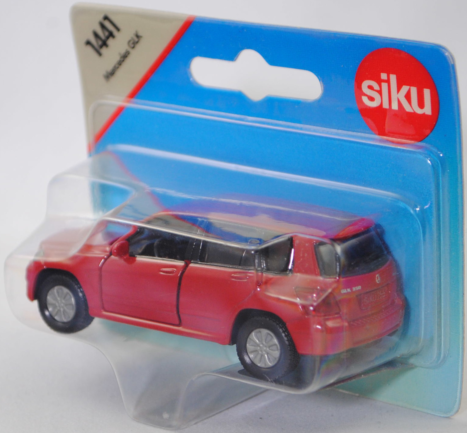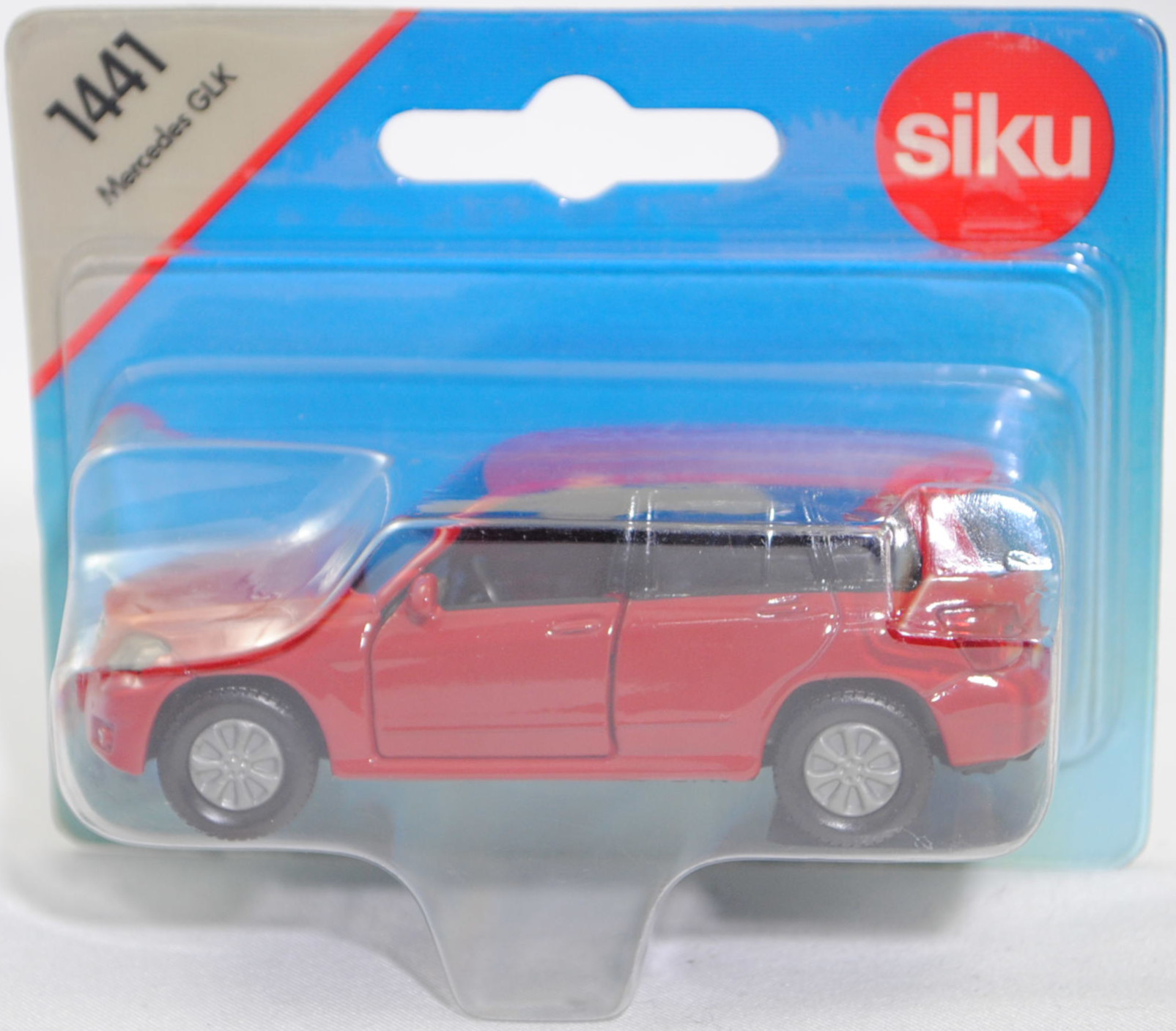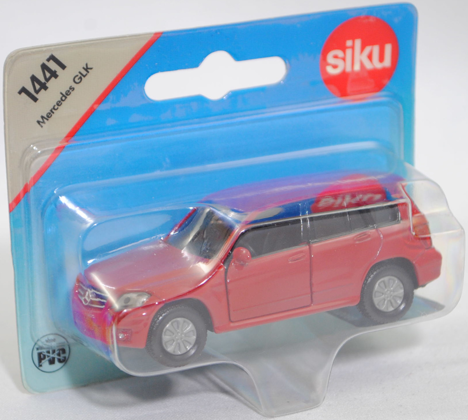 00002 Mercedes-Benz GLK 350 4MATIK (1. Generation, Baureihe GLK, interne Baureihenbezeichnung X 204, fünftüriger SUV (Sport Utility Vehicle) mit 5 Sitzplätzen, Konstruktionsbezeichnung X 204 E 35 4, Baumuster 204.987, Vertrieb in Deutschland bis 2011 und als Exportmodell bis 2012, Vor-MoPf (vor Modellpflege, Vorfacelift), Hauptscheinwerfer als Halogen-Scheinwerfer mit separaten Halogenlampen für Abblendlicht und Fernlicht, Kühlergrill mit drei Lamellen, Stoßfänger vorne mit rautenförmigen Einsatz außen und integrierten runden Nebelscheinwerfern sowie trapezförmigem Lüftungsgitter mittig wobei die längere Trapezseite an der Oberseite angeordnet ist, Stoßfängerunterseite mit integriertem Unterfahrschutz vorne glatt ohne Profilierung, Rückfahrscheinwerfer breit und mittig angeordnet, hohe Rückstrahler im hinteren Stoßfänger mit kurzem Übergang zur Seite kurz über den Auspuffendrohren angeordnet, Stoßfänger hinten mit gerade verlaufender Abschlusskante unten, Auspuffendrohren unterhalb des Stoßfängers angeordnet, Ausstattungslinie Grundmodell: Klarglas-Halogenscheinwerfer mit Projektionstechnik + Nebelscheinwerfer und Nebelschlussleuchte mit Klarglasabdeckung + Lufteinlass mit silbernen Lamellen + Außenspiegel links und rechts beheizt, von innen elektrisch einstellbar + Blinkleuchten in den Außenspiegeln + Türgriffe in Wagenfarbe lackiert + Kombiinstrument mit 3 analogen Rundinstrumenten und Display + Blinker mit Komfort-Tipp-Schaltung + Parameterlenkung + Sonnenblenden mit beleuchtetem Make-up-Spiegel + Handschuhkasten beleuchtet, klimatisier- und abschließbar + Ablagefach und Doppelcupholder in der Mittelkonsole + Armauflage vorne seitlich klappbar mit Ablagefach + Vordersitze mit elektrischer Höhen- und Lehnenverstellung, mechanischer Sitzkissenneigungsverstellung und Fahrersitz mit mechanischer Lordosenstütze + Polsterung Stoff Boston + Kartentaschen an Fahrer- und Beifahrerlehne + Einstiegsschienen vorne und hinten, vorne mit Schriftzug Mercedes-Benz + Seitenschweller schwarz genarbt + 3. Bremsleuchte in LED-Technik + Heckscheibenwischer mit automatischer Zuschaltung bei Rückwärtsfahrt + Leichtmetallräder im 7-Speichen-Design Größe 7,5 J x 17 ET 47,5 mit Reifen 235/60 R 17, 7G-Tronic (7-Gang-Automaikgetriebe), permanenter Allradantrieb 4MATIC, Motor: Mercedes-Benz Typ M 272 E 35 wassergekühlter Sechszylinder-V-Viertakt-Otto mit mirkoprozessorgesteuerter Einspritzung mit Heißfilm-Luftmassenmessung und zwei obenliegende Nockenwelle (DOHC = Double Overhead Camshaft) je Zylinderreihe sowie 4 Ventile pro Zylinder und 3498 cm³ sowie 272 PS, Baumuster Motor 272.971, Radstand 2755 mm, Länge 4528 mm, Modell 2008-2012), karminrot (vgl. feueropal beim Original, Farbcode 590 bzw. 3590), innen schwarzgrau, Sitze schwarzgrau, Lenkrad schwarzgrau, Lamellen und Mercedes-Benz-Stern im Kühlergrill silber, Druck Mercedes-Benz-Stern und GLK 350 / 4MATIC in silber auf der Heckklappe, Bpr. 1441 unter der Vorderachse und CE-Zeichen mittig hinter der Vorderachse sowie siku-Logo mittig auf dem Chassis, B45 silbergrau (Mercedes-Benz Leichtmetallräder im 7-Speichen-Design (Code R44) Größe 7,5 J x 17 ET 47,5 mit Lochkreis 5 x 112 (Teilenummer A 204 401 59 02, Farbcode silber) und Nabendeckel / Radzierdeckel (Teilenummer A 171 400 00 25, Farbcode silber mit Rand in royalblau (Farbcode 5337) sowie Stern in der Mitte und Lorbeerkranz außen) sowie Reifen 235/60 R 17 102V), SIKU SUPER, ca. 1:55, P29b (Vitrinenmodell, Schachtel mit Lagerspuren) (EAN 4006874014415)