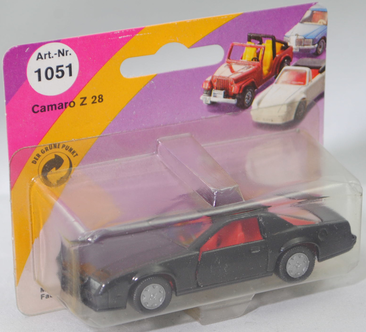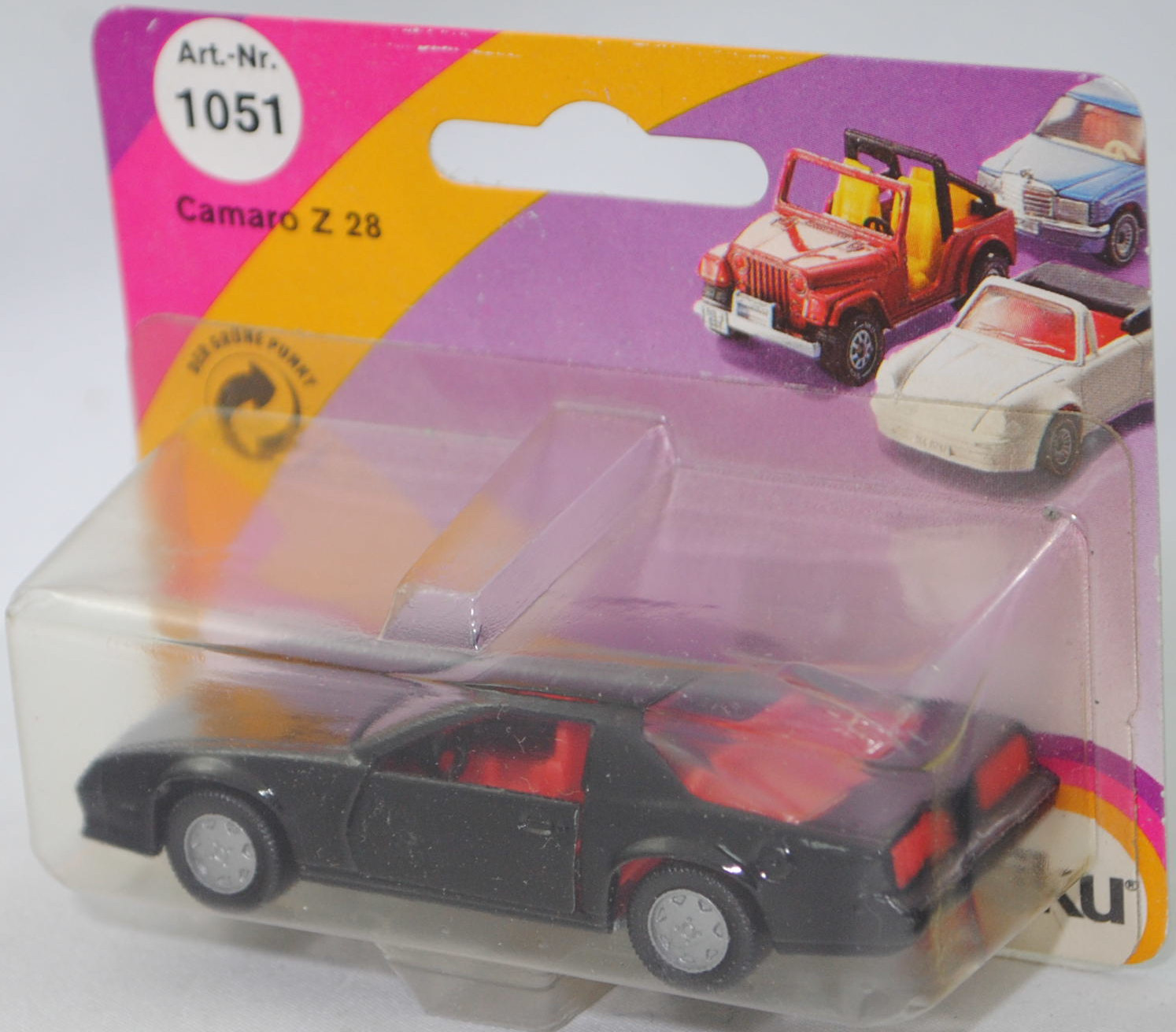 00004 Chevrolet Camaro Berlinetta 5.0L V8 (3. Generation, Baureihe Camaro, F-Body-Plattform der 3. Generation, zweitüriger Sportwagen als Coupé mit 4 Sitzplätzen, Vorfacelift, Frontschürze vorne leicht abgewinkelt und nicht so tief heruntergezogen, Ausstattungslinie Berlinetta: schwarz lackierte Scheinwerferhöhlen + Stoßfänger vorne mit 3 Lüftungsschlitzen zwischen den Frontscheinwerfern + Blinker im Stoßfänger vorne quadratisch + Stoßfänger vorne und hinten in Wagenfarbe + Motorhaube ohne Lüftungsschlitze + Sportspiegel in Wagenfarbe, links elektrisch verstellbar und rechts manuell + vollständige Instrumentierung mit Tachometer, Drehzahlmesser, Tageskilometerzähler, Kraftstoff-, Voltmeter-, Öl- und Temperaturanzeigen + elektrische Quarz-Analoguhr + abgedecktes Staufach + gepolstertes Lenkrad mit quadratischer Nabe + Zweiklang Hupe + verstellbare Vordersitze und umklappbare Rücksitzlehne + Türverkleidungen unten mit Teppichbezug + mit Teppich bezogene Radkästen und Seitenwände + Innenraumbeleuchtung + Zierstreifen in gold/schwarz unten rundherum + Deluxe-Gepäckraumverkleidung + Heckscheibe mit schwarzem Rand + Tankdeckel + goldfarbene Embleme und Typenbezeichnungen + spezielles komfortables Fahrwerk + 14'' x 7'' Aluminiumfelgen im Flossen-Design gold akzentuiert + Stahlgürten-Radialreifen 205/70 R 14, Sonderausstattung gegen Mehrpreis: Chevrolet 5,0 Liter 4-Bbl. V8 Motor mit 5001 cm³ und 147 PS (1982) bzw. 152 PS (1982-1984) + 3-Gang Automatikgetriebe, 3-Gang Automatikgetriebe, Hinterradantrieb, Motor: General Motors-Chevrolet Motor Division Typ 5.0 Liter 4-Bbl. V8 (Turbo-Fire V-8, Small Block mit 305,2 cui, Bestellcode LG4) wassergekühlter Achtzylinder-V-Viertakt-Otto mit einem Fallstrom-Doppel-Registervergaser Rochester E4ME-4 barrel und eine zentrale Nockenwelle sowie OHV-Ventilsteuerung (OHV = overhead valves) und 2 Ventile pro Zylinder sowie 5001 cm³ und 147 PS (1982) bzw. 152 PS (1982-1984), Radstand 2565 mm, Länge 4770 mm, Modell 1982-1984), schwarz (vgl. black beim Original, Verkaufskennzeichen 19, Farbcode WA848 / W5A848), innen verkehrsrot, Sitze verkehrsrot, Lenkrad schwarz, Bpr. CAMARO Z 28, Hong, Chassis chrom, mit CE-Zeichen, Verglasung rauch, B6 (Chevrolet Aluminiumfelgen im Flossen-Design mit 15 Speichen gold akzentuiert Größe 7 J x 14 ET 8,6 mit Lochkreis 5 x 120,65 (Teilenummer 14048328, Farbcode gold akzentuiert (chrom/gold)) und Nabendeckel / Radzierdeckel (Teilenummer Deckel 14035580 mit Farbcode chrom sowie Teilenummer Abdeckkappe 14035578 mit Farbcode schwarz und Schriftzug berlinetta in gold) sowie Stahlgürten-Radialreifen 205/70 R 14), SIKU SUPER, ca. 1:59, P23 (Vitrinenmodell, Schachtel mit Lagerspuren) (EAN 4006874010516)