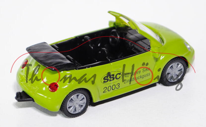 00401 VW New Beetle Cabrio 2.0 (Typ 1Y, Modell 2003-2005), hell-maigrün, innen schwarz, Lenkrad schwarz, Druck 40 Jahre Siku / Zinkdruckguss / 2003 und SSC-Logo in schwarz auf den Seiten, Druck Blumenstrauß in schwarz auf der Motorhaube, Verdeck schwarz, B16 silbergrau, SIKU SUPER, ca. 1:55, Limited Edition (EAN 4006874010561)