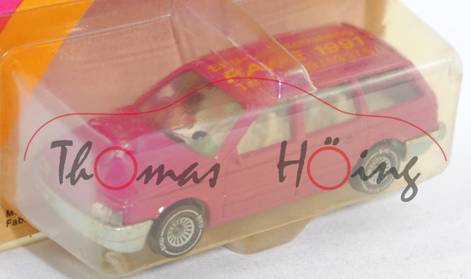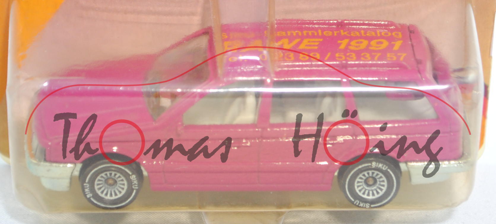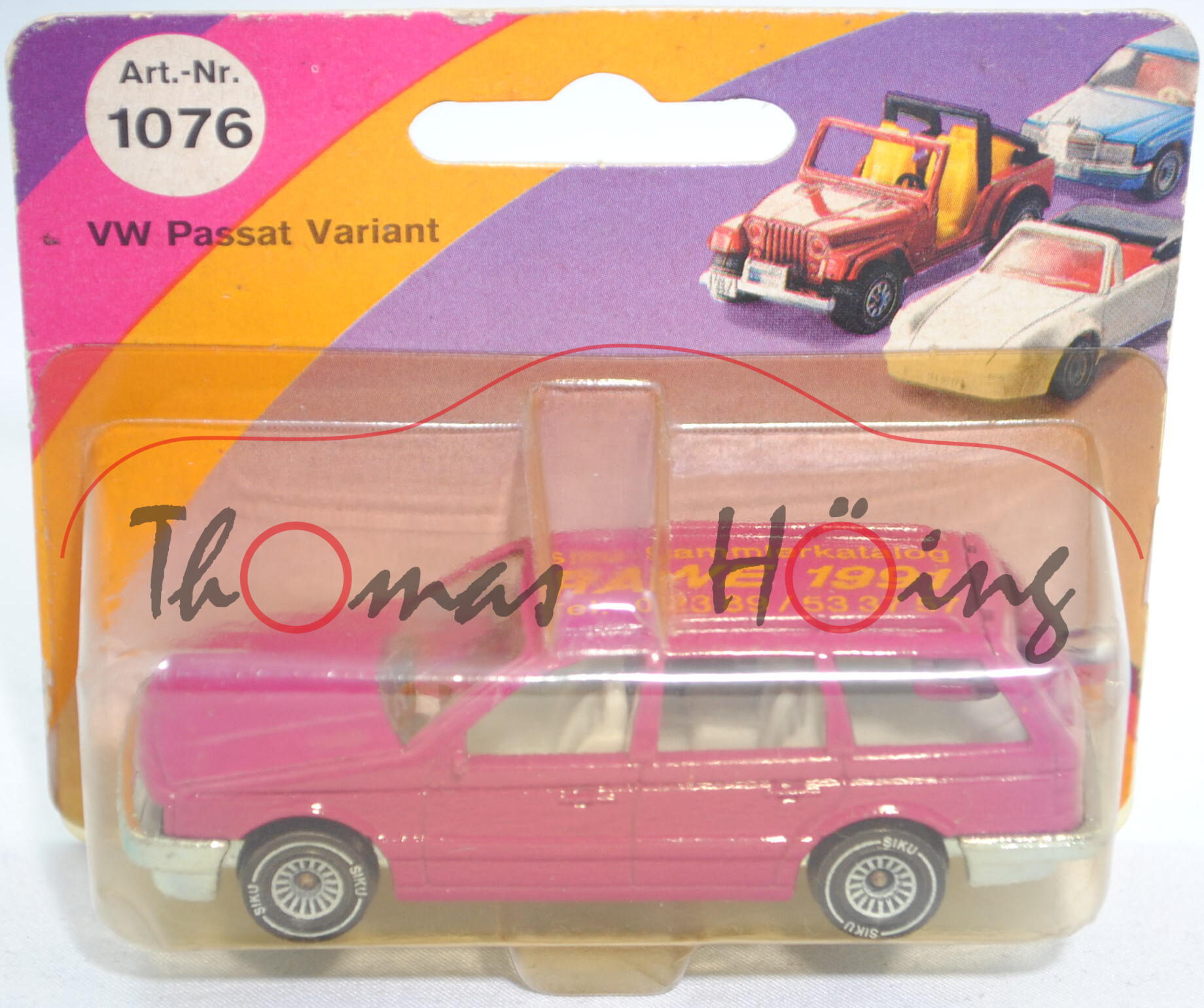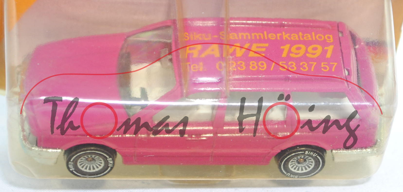 VW Passat Variant (B3, Typ 35i, Modell 1988-1993), verkehrspurpur, innen lichtgrau, Lenkrad schwarz, Druck Siku-Sammlerkatalog / RAWE 1991 / Tel. 02389/533757 in honiggelb von links aus lesbar auf dem Dach, ohne VW-Zeichen im Grill, W-Germ, Chassis chrom, mit CE-Zeichen, Schachtelrückseite mit CE-Zeichen, B4, SIKU SUPER, ca. 1:55, P23 (Limited Edition) (EAN 4006874010769)