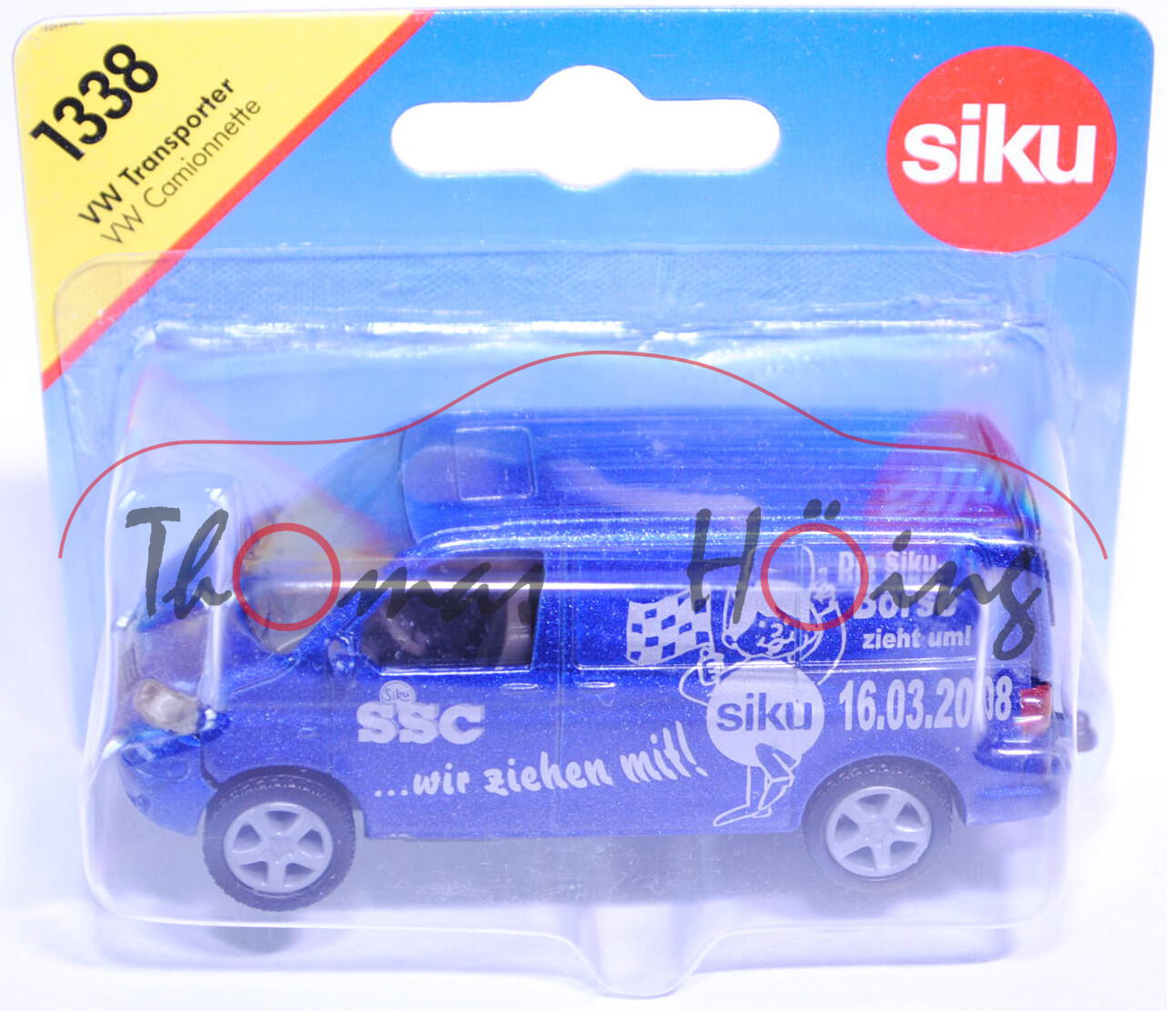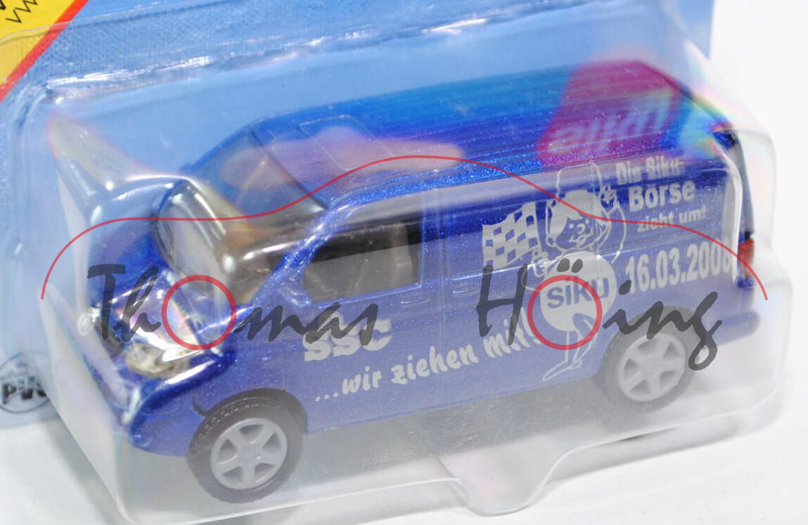 00412 VW T5 Transporter (Typ 7H, Modell 2003-2009), dunkelblauperleffekt metallic, innen betongrau, Lenkrad betongrau, Druck SSC-Logo und Die Siku- / Börse / zieht um! / 16.03.2008 / ...wir ziehen mit! sowie Siku-Flaggenmännchen in silber auf den Seiten, Druck VW-Logo und TRANSPORTER in silber auf der Heckklappe, Druck 03/ / 2008 und SSC-Logo in silber auf dem Chassis, Druck 4 dunkelblauperleffekt metallic farbene Streifen und VW-Logo in silber im Grill, Stoßstange Bestandteil des Chassis, schwarz bedruckte Lüftungsgitter über dem Nummernschild in der Stoßstange, mit Prägung von Lüftungsgitter neben dem Nummernschild, Nummernschild SI-KU 152, Chassis basaltgrau, B21 silbergrau, SIKU SUPER, ca. 1:58, P29a (Sondermodell Siku-Sammler-Club e.V., Limited Edition) (EAN 4006874013388)