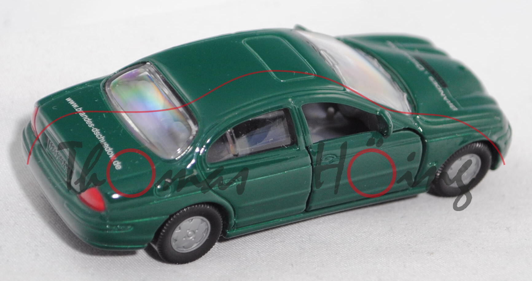 00401 Jaguar S 4.0 V8 (Typ CCX / X200, Modell 1999-2002), moosgrün, innen hell-staubgrau, Lenkrad hell-staubgrau, Druck BRANDES & DSCHÜDOW / THINK QUALITY in silber/schwarz auf der Motorhaube, Druck www.brandes-dschuedow.de in silber auf dem Kofferraumdeckel, Bpr. S 4.0 V8 und technische Daten mit 3996 ccm, Variante 2, B6, SIKU SUPER, ca. 1:57, limitiertes Sondermodell Siku-Museum, Limited Edition (EAN 4006874013760)